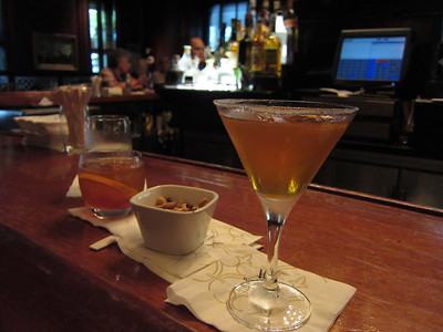 Für einen Sidecar Cocktail die Zutaten in einem Shaker mit Eiswürfeln mixen und anschließend in ein Cocktailglas abgießen - die Eiswürfel bleiben im Shaker.