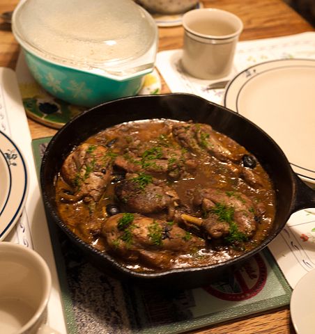 - Die Tomaten überbrühen, enthäuten und entkernen, grob hacken und zum Geflügel geben. Den Weißwein, die Hühnerbrühe und 2/3 der Knoblauchzehen (durchgepreßt) zugeben; alles etwa 45 Minuten schmoren lassen.