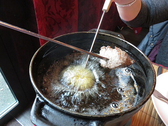 - Mit der Fonduegabel jeweils ein Fleischstück aufspießen, ins heiße Fett halten und nach Geschmack braten.