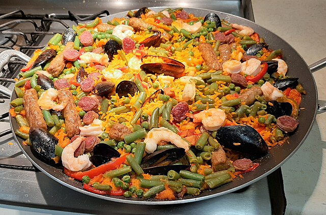 - Gemüse, Muscheln, Krabben und Champignonblättchen unter den Reis mischen. Mit Salz, Pfeffer und Cayennepfeffer abschmecken. Nochmals 5 bis 10 Minuten ziehen lassen bis der Reis weich ist.