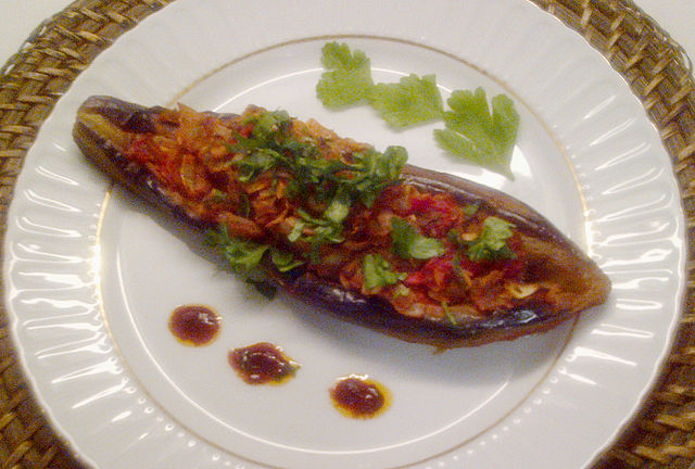 - Die Auberginen ausdrücken. Die Schlitze auseinander ziehen und die Taschen mit dem Gemüse füllen. Die Auberginen in einen Topf legen. Die restliche Füllung auf die Schlitze legen. Die Knoblauchzehen schälen, in Stifte schneiden und diese in die Füllung stecken. Das Öl mit 1/4 l Wasser verrühren und über die Auberginen gießen.