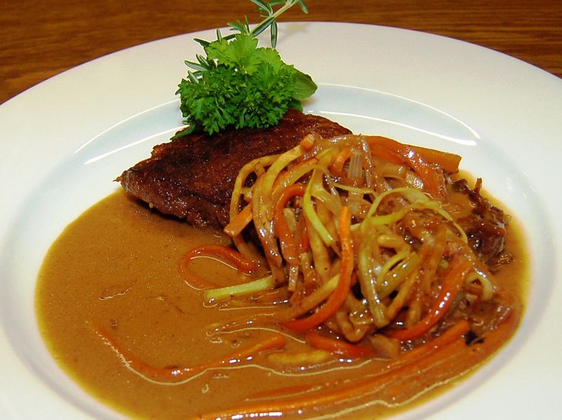 - Soße durch ein Sieb rühren, mit Zitronensaft, Madeira und Sahne verfeinern, abschmecken und das in Scheiben geschnittene Fleisch hineingeben.